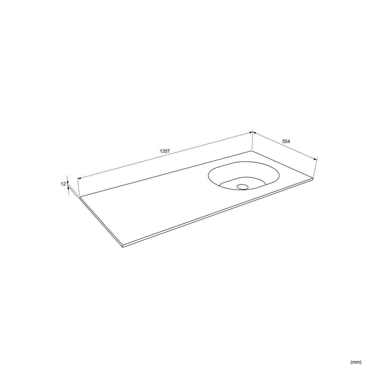 Deze eersteklas asymmetrische Solid Surface wastafel met geïntegreerde waskom heeft een breedte van 135 cm, een diepte van 55 cm en een randhoogte van 1,2 cm. Deze prachtige mat wit wastafel is de eyecatcher van je badkamer.