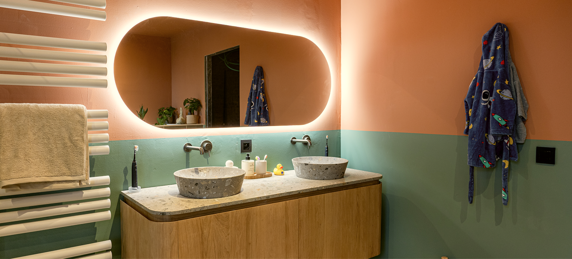 Naturel eiken matcht mooi met het natuurstenen Balmani Moon wastafelblad en de Balmani Still waskommen in Greige Terrazzo.