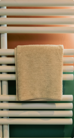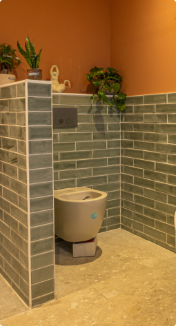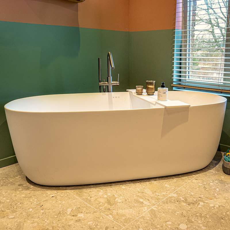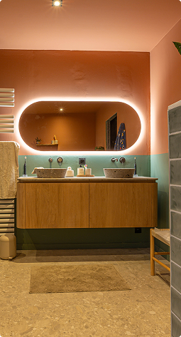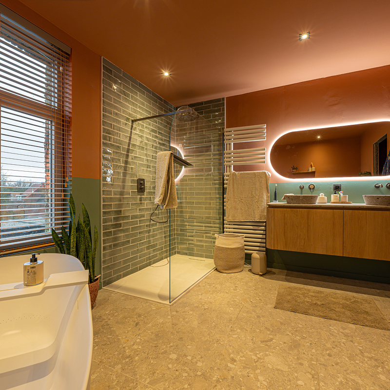 Deze gezinsvriendelijke badkamer brengt comfort en karakter mooi samen. Kleurrijk, ruim en helemaal compleet. De combinatie van warm terracotta en zachte groentinten zorgt voor een levendige sfeer. En dankzij de slimme indeling voelt alles open en overzichtelijk aan. Met een ligbad, inloopdouche en toilet is elke vierkante meter goed benut.