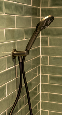 De douchezone straalt rust en eenvoud uit dankzij de groene wandtegels. De Balmani Modular inloopdouche met GunMetal profielen sluit daar mooi op aan. Deze PVD-kleur zorgt voor een leuk accent, zonder te overheersen. De Solid Surface Balmani Andes douchebak voelt strak aan en is eenvoudig schoon te houden. Alles samen: een doucheplek die zowel praktisch als stijlvol is.