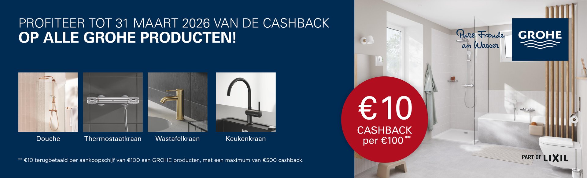 Bij aankoop van Grohe kranen bij X2O krijg je tijdelijk €10 cashback per aankoopschijf van €100, met een maximum van €500 cashback!