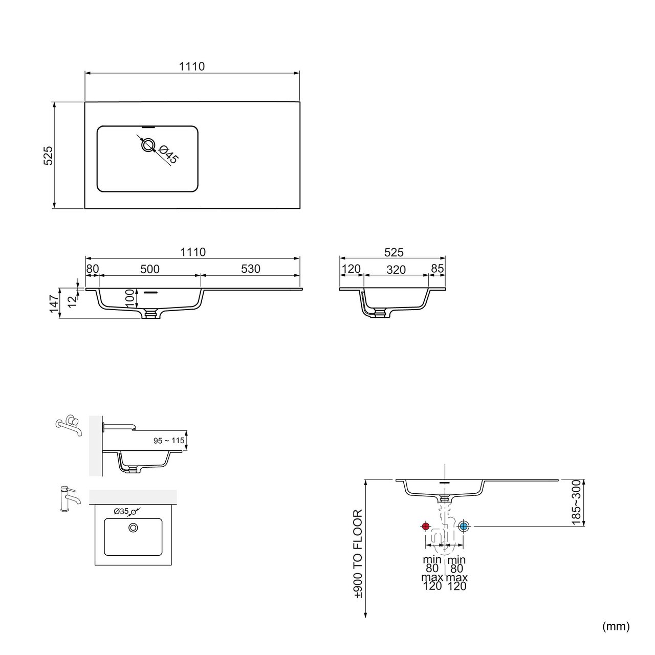 Deze wastafel is ook beschikbaar in andere afmetingenen in een variant met randhoogte 9 cm.