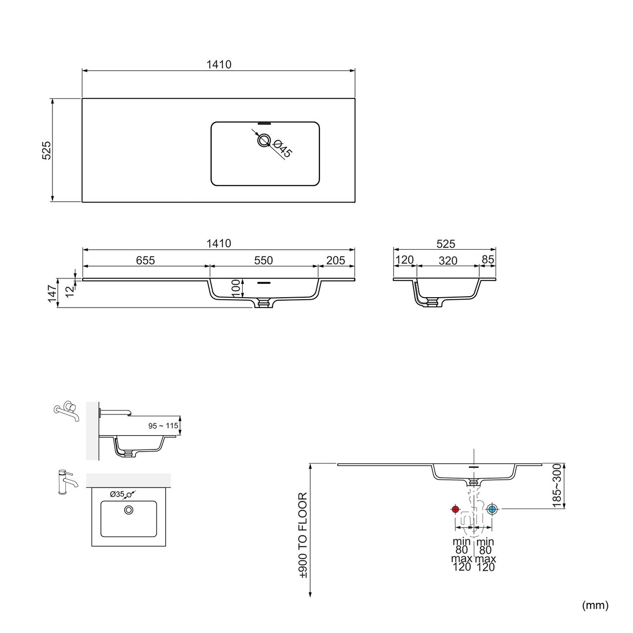 Deze wastafel is ook beschikbaar in andere afmetingenen in een variant met randhoogte 9 cm.