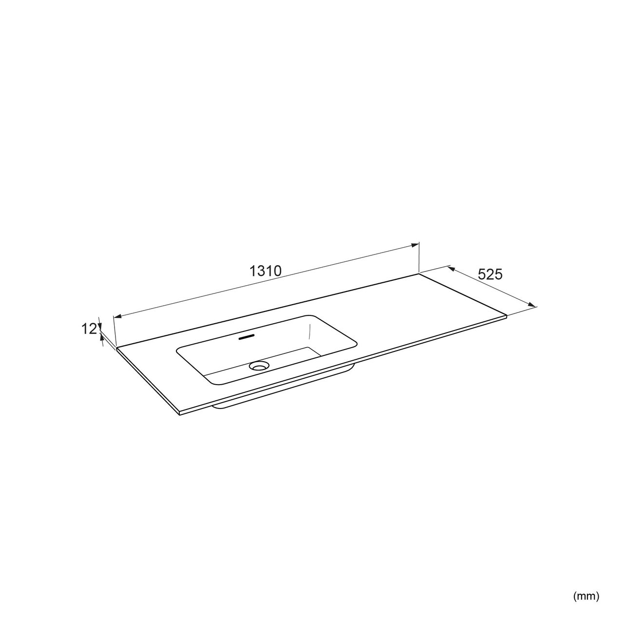 Deze asymmetrische Solid Surface wastafel met geïntegreerde waskom heeft een breedte van 130 cm, een diepte van 52 cm en een randhoogte van 1,2 cm. Deze mat witte wastafel past in elke badkamer door zijn elegante afwerking.