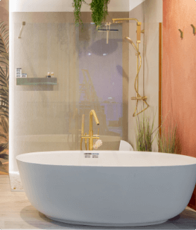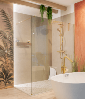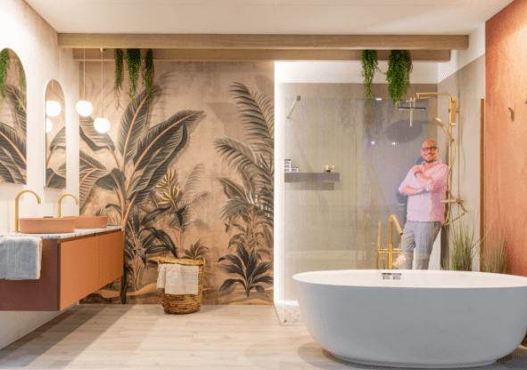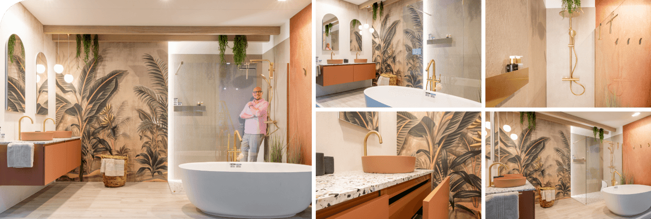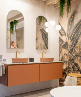 Deze badkamer, ontworpen door interieurarchitect Bart Appeltans, laat niemand onverschillig. De warme terracotta tinten, gouden accenten en tropische printwand zorgen voor een luxueus wow-effect bij elke binnenkomst. Een vrijstaand bad, ruime douche en elegante opbergruimte maken het plaatje compleet.